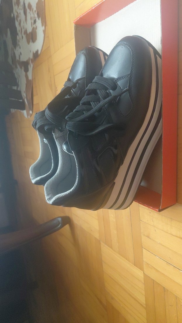 Siyah ve gri renkte, bağcıklı platform topuklu kadın spor ayakkabısıdır. Kauçuk tabanı dayanıklıdır, spor ve sokak tarzı için uygundur. Çok rahat bir kalıp yeniden farksız sorunsuz defosuz