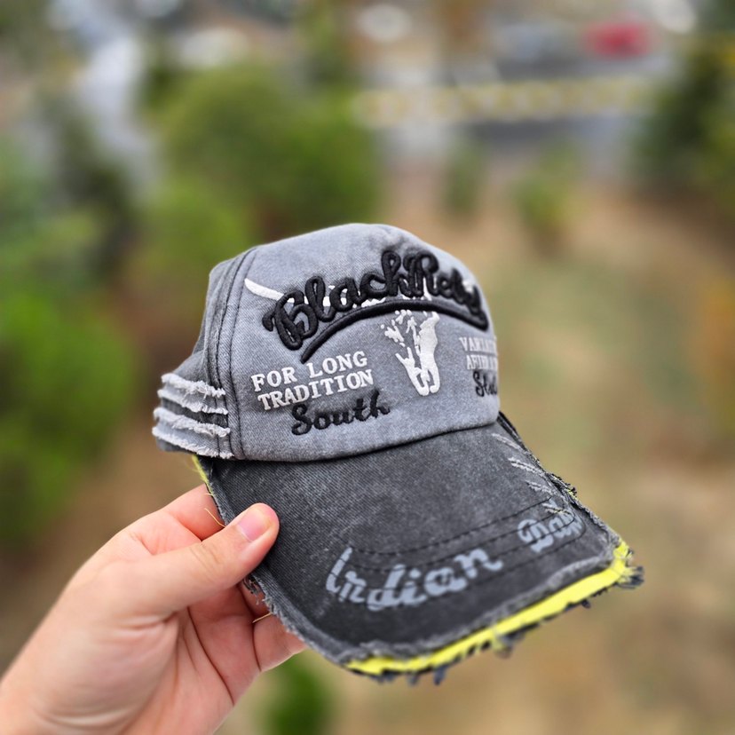 Sentetik kumaştan yapılmış siyah gri rock punk tarzı kadın şapka. Tokalı detaylara ve nakışlı yazılara sahip, aşınmış görünümlü.