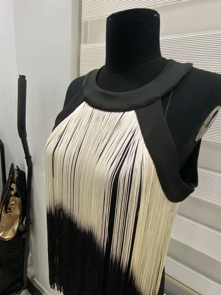Siyah ve gri tonlarında, kolsuz ve tekne yaka bluz. Püskül detayları ve düzenli kesimi ile çağdaş bir tasarım.