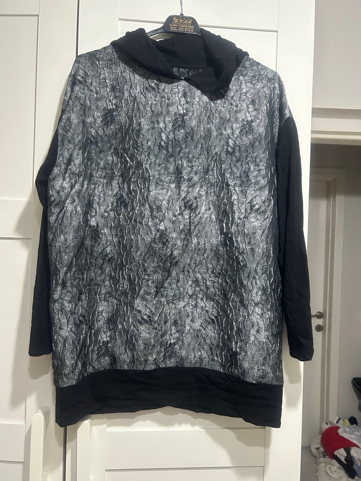Siyah ve gri karışımı sweat standart bedendir hiç kullanılmamıştır, kolları penye ön ve arka jakarlı kumaştır .