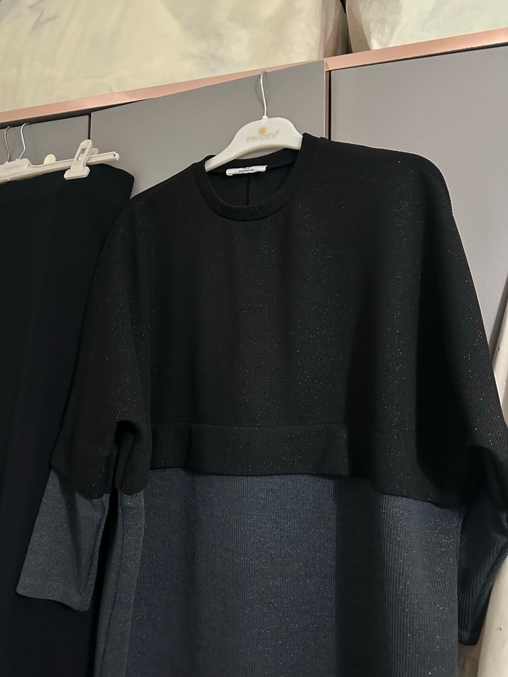 Kadınlar için uzun kollu, yuvarlak yaka ve bol kesim kazak. Siyah ve gri tonları, desen içermeyen minimalist tasarım. Yumuşak sentetik kumaştan, günlük kullanım için uygundur. Uzun boyu ve sade stiliyle zahmetsiz şıklık sunar.