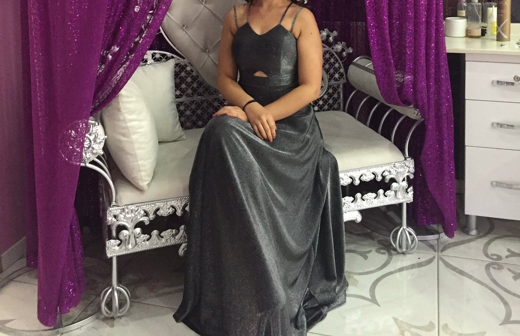 Drapeli, askılı ve V yakalı bu siyah-gri uzun abiye, gotik tarzı ve şık tasarımıyla partiler için uygundur.