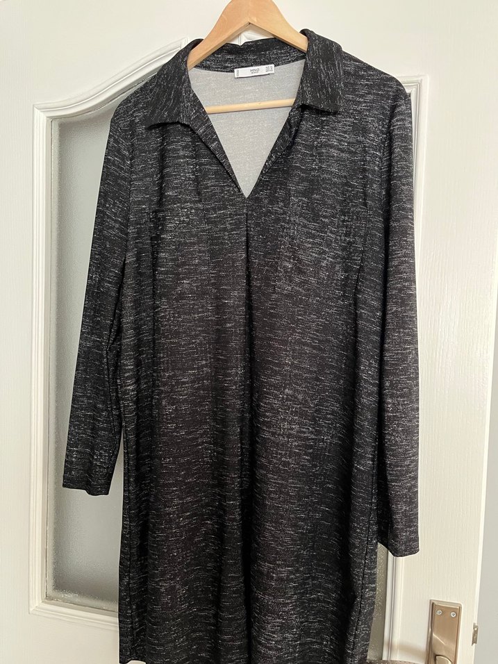 Gri renkli, V yakalı ve uzun kollu Midi boyu düz elbise vücuda yapışmıyor