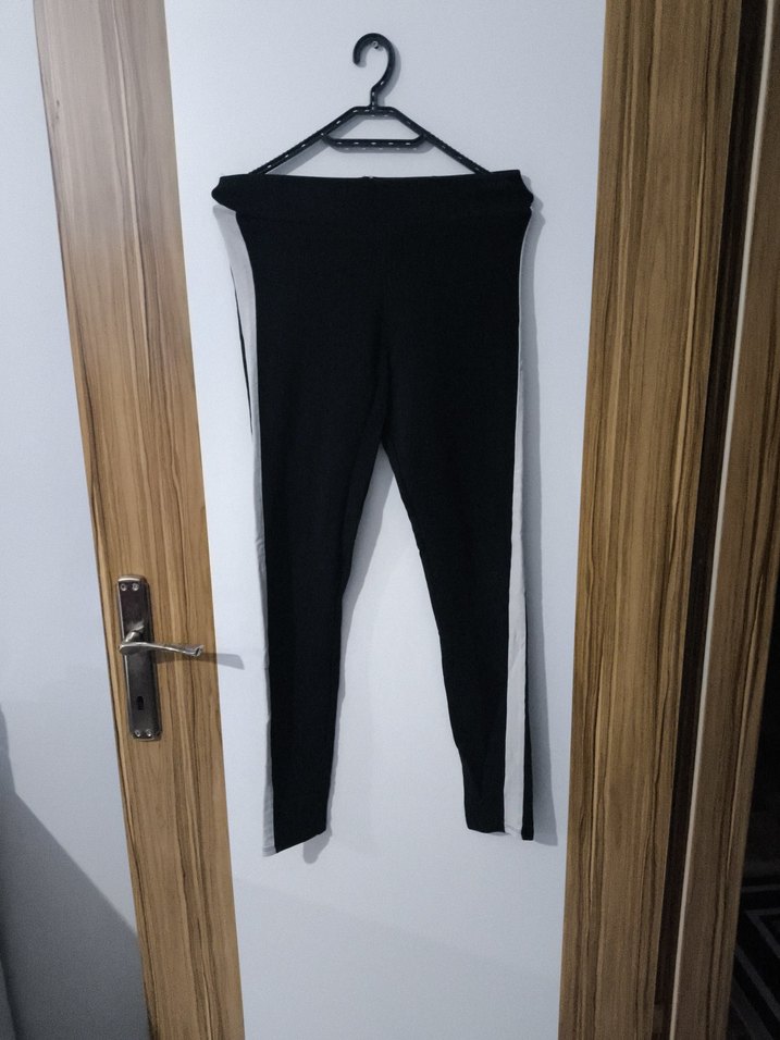 Esnek sentetik kumaştan, siyah ve gri yan şeritli, spor ve günlük kullanıma uygun, dar kesim kadın tayt.