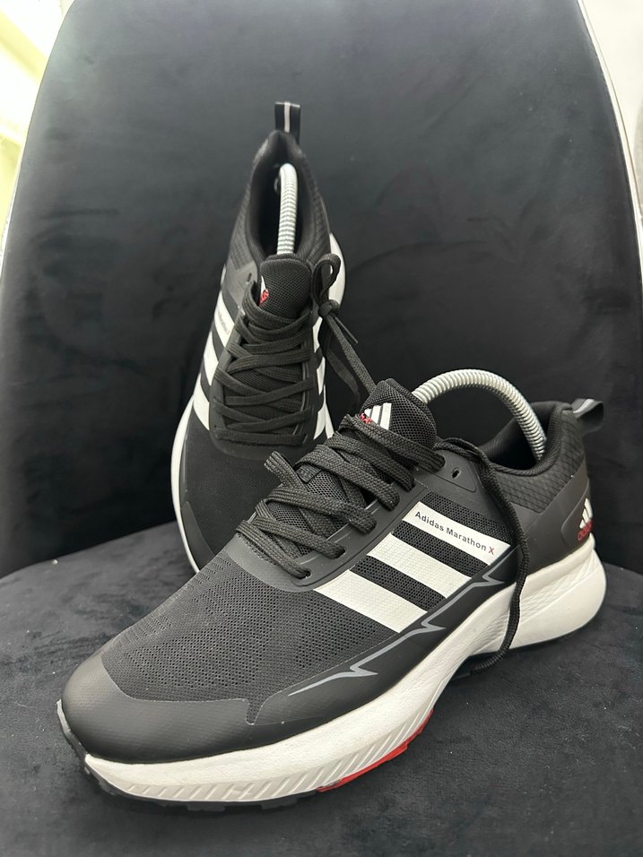 Siyah ve gri zebra desenli, bağcıklı erkek spor ayakkabısıdır. Kauçuk tabanlı, spor ve günlük kullanıma uygundur. ♂️ Adidas marathon Orjinal ithal tek numara 41.5