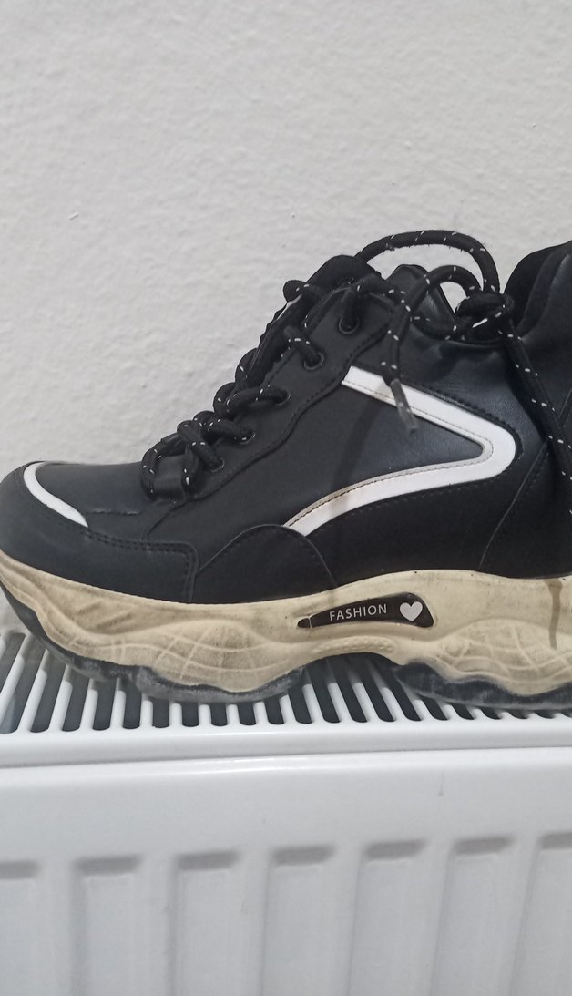 Siyah ve gri zebra desenli, dolgu topuklu ve bağcıklı kadın spor ayakkabısı. Kauçuk tabanlı, sportif sokak stili için uygun.