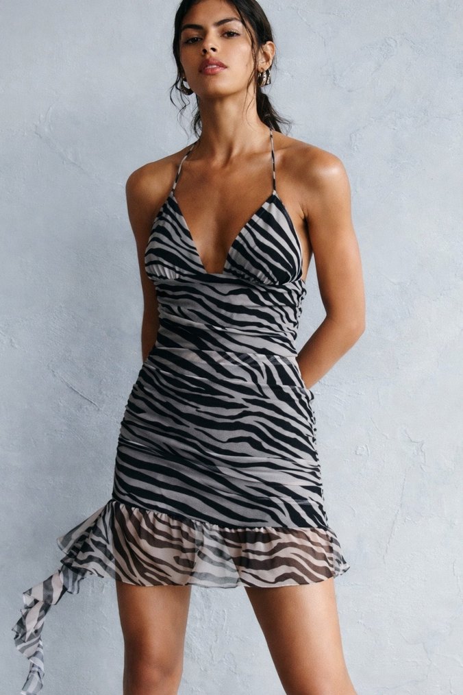 V yaka ve ince askılı, zebra desenli, drapeli, siyah gri midi elbise. Yumuşak sentetik kumaştan, dikkat çekici parti stili için uygun.