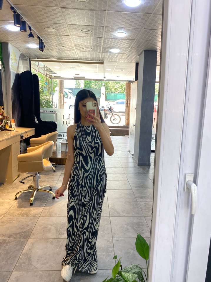 Siyah gri zebra desenli, yüksek yakalı, kolsuz ve bol kesim uzun elbise. Sentetik kumaştan üretilmiş, çok şıktır bi kere giyildi kusuru yok