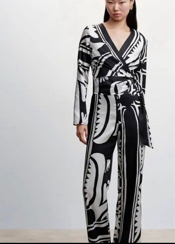 Uzun, salaş kesimli ve drapeli kadın tulumu, V yaka ve ipeksi kumaşla siyah gri zebra deseni taşır. Günlük kullanıma uygundur.