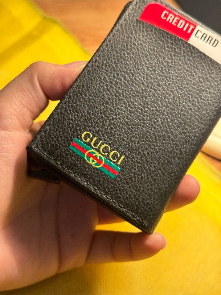 Bu siyah erkek cüzdanı, baskılı Gucci logosu ve dokulu yüzeye sahiptir. Kart yuvalarında kredi kartı görünür, sokak stili ile iş şıklığını birleştirir.
