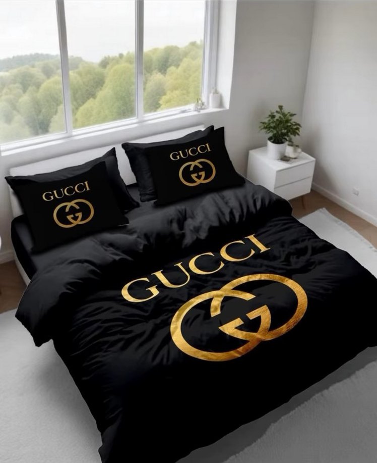 Siyah zemin üzerine altın renkli Gucci logosu baskılı nevresim ve yastık kılıfları seti. Yatak odasına şık ve iddialı bir hava katar. ️