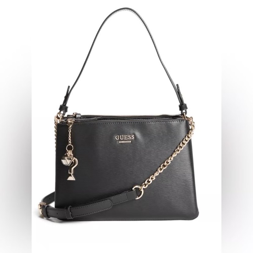 GUESS marka parlak siyah deri, fermuarlı kadın çanta, baskılı desenli, günlük sokak stili için uygun.