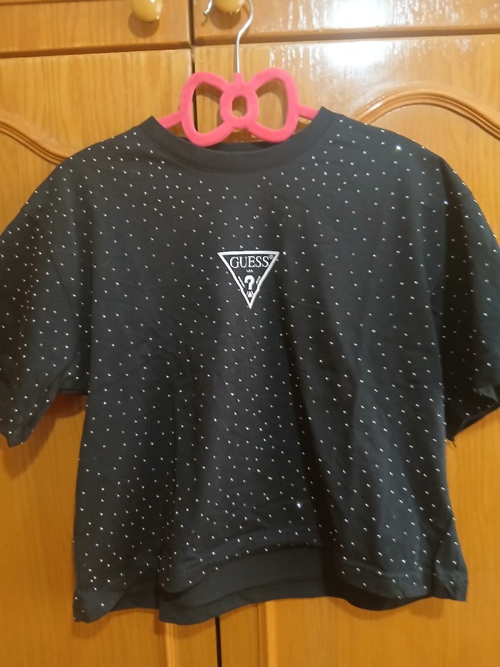 hediye geldi hiç kullanılmadı.Siyah Guess kadın tişörtü, yuvarlak yaka ve kısa kollu, payetli detaylı ve baskılı logo ile. Pamuklu, bol kesim, günlük kullanıma uygun. ✨