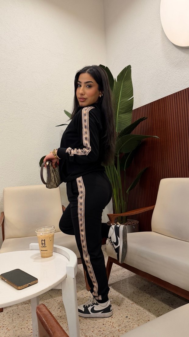 Uzun kollu, yüksek yakalı siyah kadın eşofmanı, etnik desenler ve kuşaklı bel detayıyla rahat, sokak stili uyumlu. Günlük kullanıma uygun sentetik kumaş.