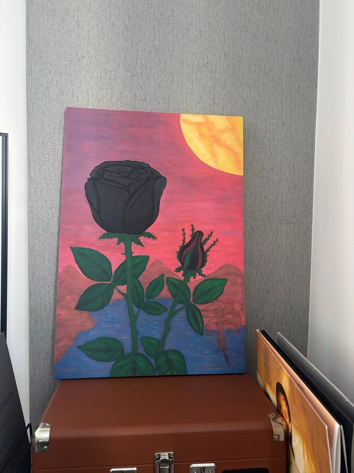 Bu tabloda siyah gül ve tomurcuk, turuncu ve mor tonlarında günbatımı gökyüzü ve mavi suyun üzerinde yer alıyor. Tablo yeni çizilmiştir. Hiç kullanılmadı
