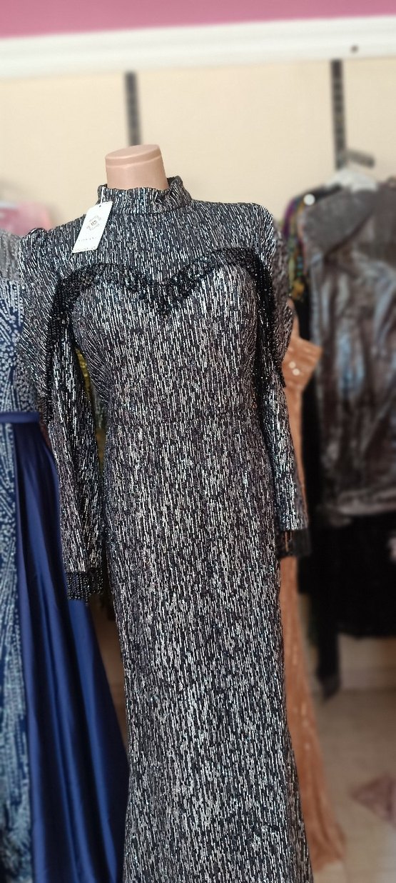 Gri renkte, payetli ve desenli uzun kollu abiye. Yüksek yakalı, regular fit kesim ve çağdaş tarzda, parti için uygun bir model. ✨