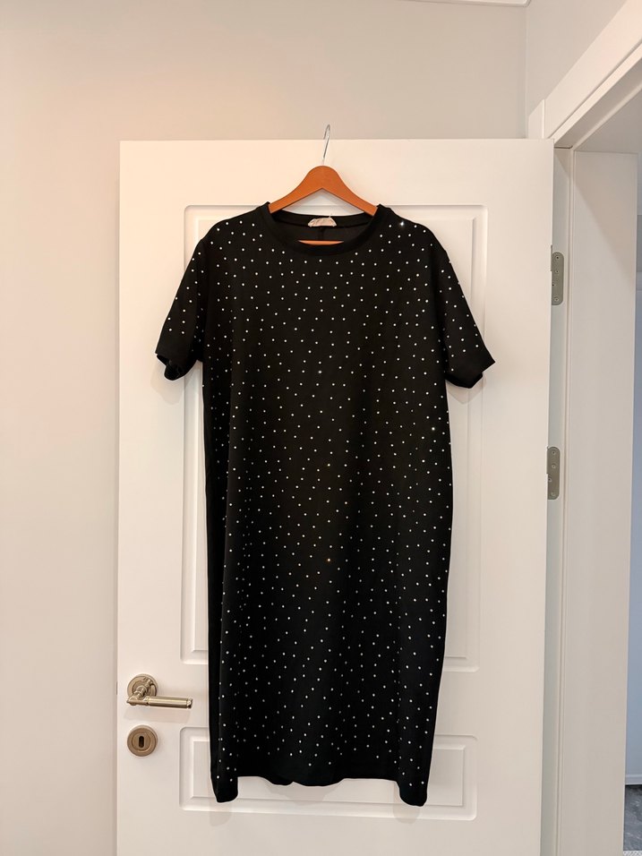 Siyah renkte, kısa kollu ve yuvarlak yakalı çok fakat 44 bedenken giydim toplam 2 kere giydim yeni gibi hiçbir defosu yoktur düşük taşı yoktur.