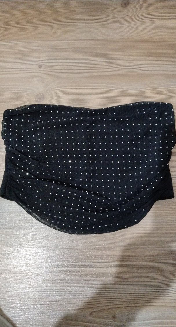 Siyah gümüş taşlı, straplez mini büstiyer, düz sentetik kumaştan yapılmıştır. Sokak modası ve günlük kullanıma uygundur.