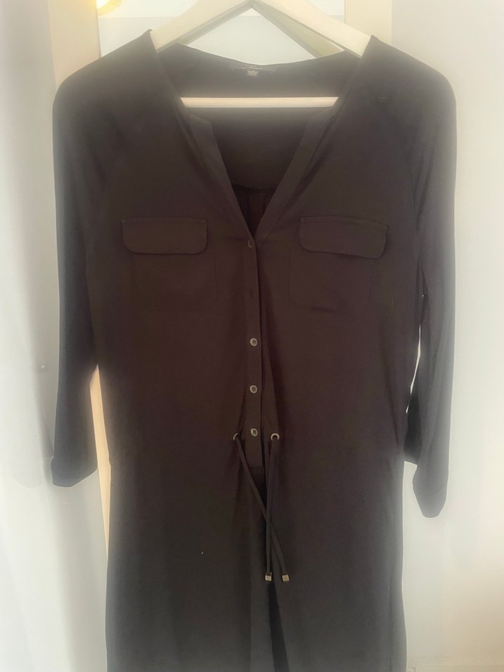 Siyah renkli, uzun kollu ve kuşaklı bel detaylı Mavi marka elbise.Gevşek kesim ve midi boyda, ofis için uygundur.
