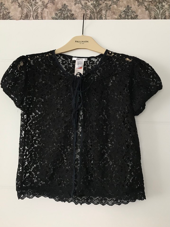 Siyah, kısa kollu, güpür ve işlemeli dantel detaylı, bohem ve retro tarzda, gövdeye oturan bluz