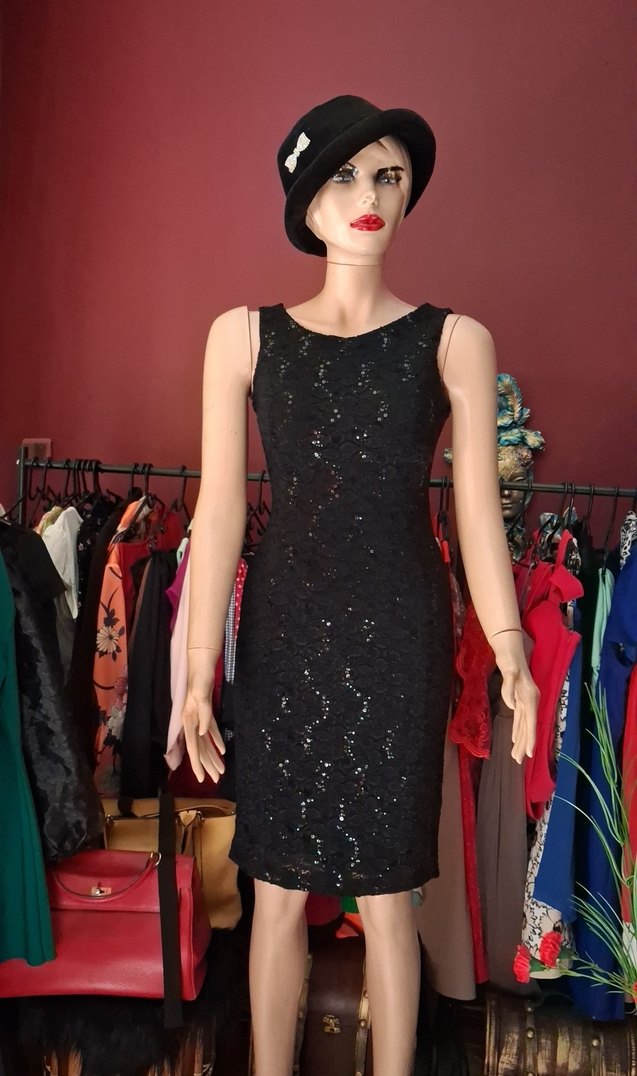 Siyah güpür üzerine pulpayet işlemeli astarlı abiye elbise