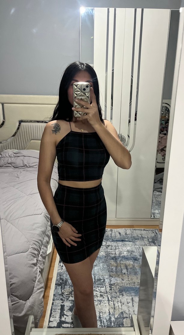 Siyah kareli, straplez yaka ve ince askılı, vücuda oturan mini elbise. Gotik ve şık tarzıyla romantik akşamlar için uygun. ✨