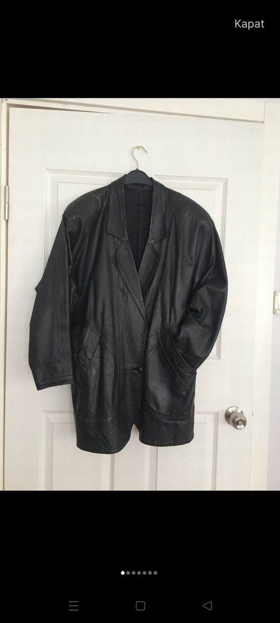 Siyah hakiki kuzu derisinden yumuşacık, erkek yakalı, yanlardan iki cepli, yarasa kollu, kurbaze tek düğmeli ceket. Yırtığı, söküğü veya kullanımı engelleyecek sorunu yoktur. Sadece kullanım kaynaklı bazı yerlerinde boyasında renk açılması vardır. Bu şekli ile de giyilebilir ama tercihen Boyatıldığında ve ütülendiğinde yeniden farksız olacaktır. Boyu 81 cm. iki koltuk arası 68cm. geniş kesimli olduğundan 40 bedene kadar uygundur.