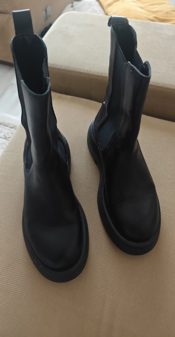 Siyah hakiki deri kadın bot. Minimalist goth tarzıyla şık ve trend bir görünüm sunar.