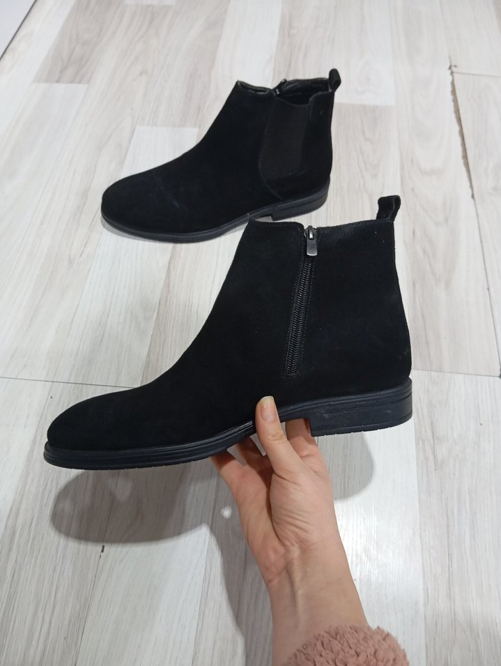 Sıfır ürün bir hatası yok siyah hakiki deri süet malzemeden fermuarlı kauçuk tabanlı erkek bot, sokak stili için uygun sade ve desensiz tasarımda, günlük kullanıma uygun.