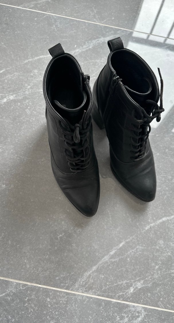 Siyah hakiki deri, tokalı, stiletto topuklu kadın botları. Minimalist goth tarzında, günlük kullanıma uygun.