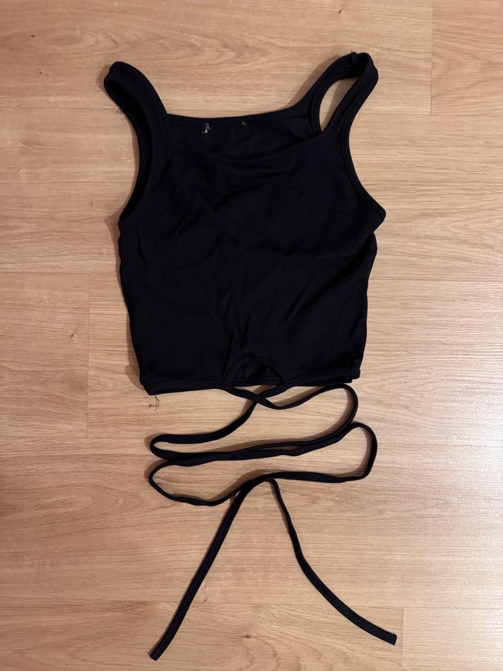 Halter yaka ve ince askılı, siyah fitted crop top. Kısa boylu, sarmalı detaylı ve pürüzsüz sentetik kumaştan, cesur goth tarzı için ideal.
