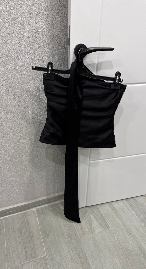Siyah, kemerli ve ince askılı halter yaka bustiyer. Sentetik kumaştan, mini boy ve gövdeye oturan kesim.