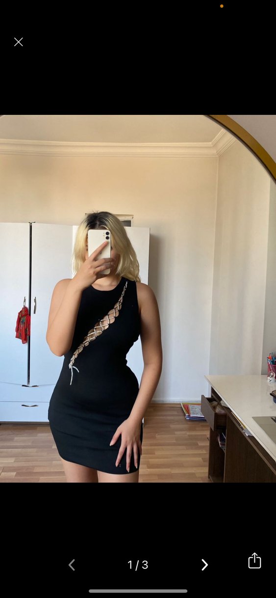 Bu siyah, vücuda oturan mini elbise halter yaka ve ince askılara sahiptir. Düz sentetik kumaştan üretilmiş olup, çapraz bağcık detayıyla minimalist gotik tarzda, romantik buluşmalar için şık bir tercihtir.