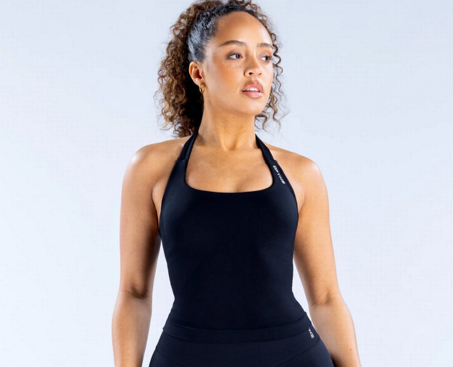 Yüksek yakalı, siyah ve kolsuz bu dar kesim spor üstü, pürüzsüz sentetik kumaştan üretilmiş olup cesur sokak stili ve spor için uygundur.