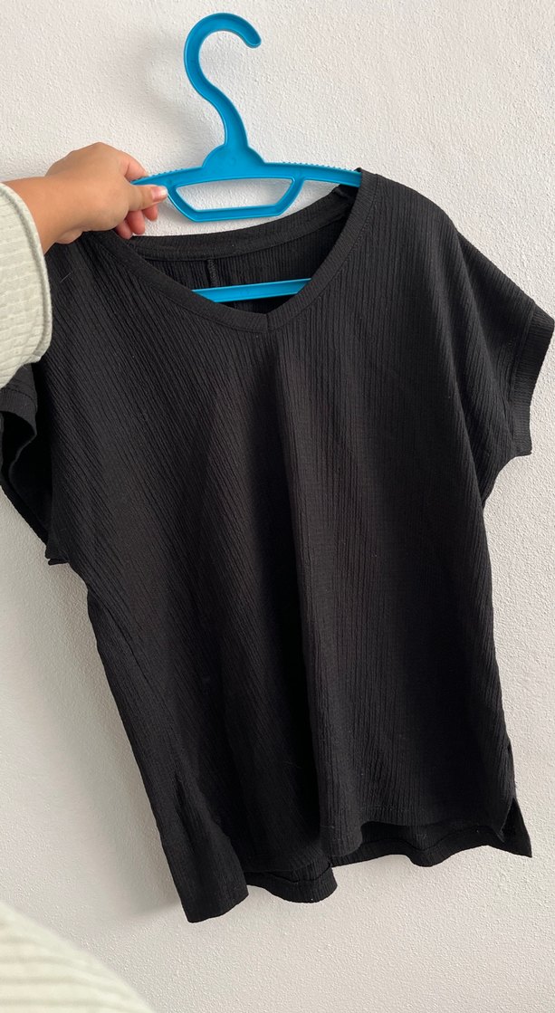 Yumuşak keten kumaştan, bol kesim, yuvarlak yaka ve kısa kollu hamile tişörtü. Pilili dokusu ve normal boyu ile günlük rahat kullanıma uygundur.