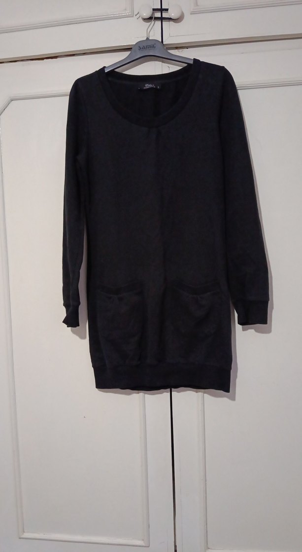 Siyah hamile midi sweatshirt, yuvarlak yaka ve uzun kolludur. Yumuşak ve sıcak kumaştan, rahat bir kesime sahiptir. Minimalist tarzda, iki ön cepli, günlük kullanıma uygundur.
