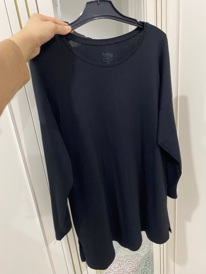 Siyah hamile sweatshirt, bisiklet yaka ve uzun kollu, yumuşak ve sıcak kumaştan üretilmiştir. Bol kesim ve midi boyda, rahat ve şık bir görünüm sunar.
