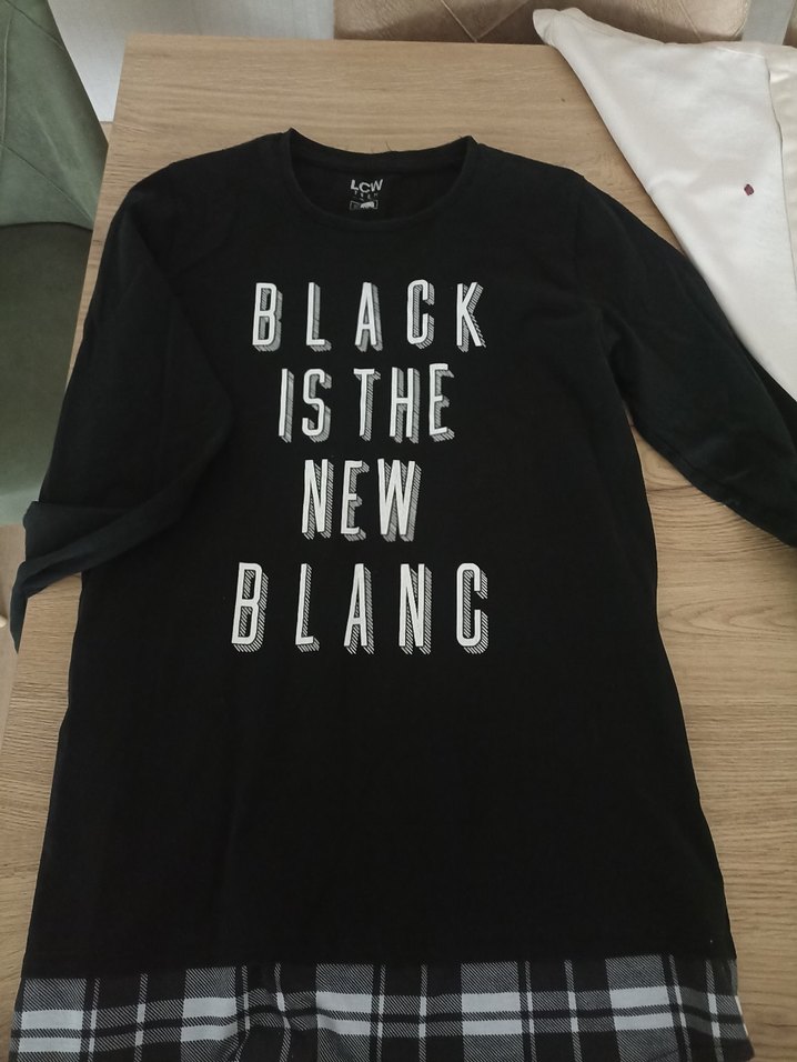 Pamuk siyah hamile tişörtü, uzun kollu ve bisiklet yaka. Baskılı slogan ve rahat kesim özellikleriyle midi boyda, ekose desen detayı bulunur.
