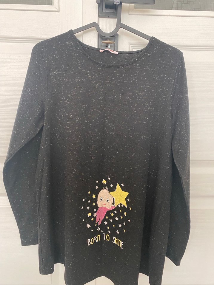 Siyah hamile tişörtü, uzun kollu ve yuvarlak yaka. Gevşek kesim, simli detay ve "Born to Shine" yazılı bebek baskılı rahat tasarım. ⭐