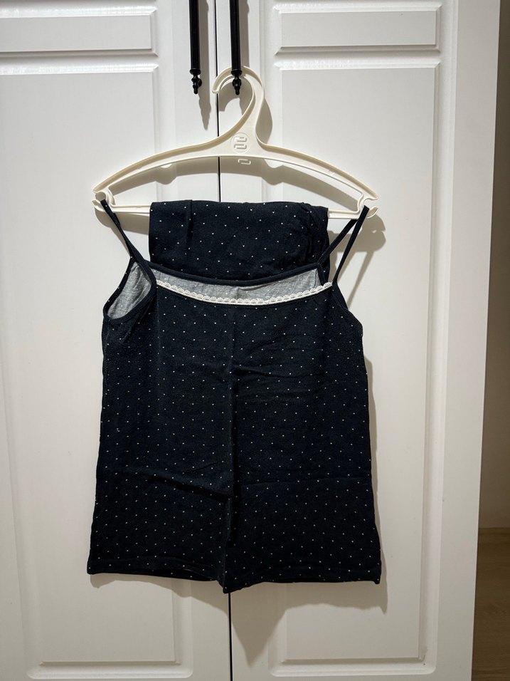 Siyah, küçük puantiyeli, askısız ve kolsuz, vücuda oturan hamile ve emzirme geceliği midi boyda.