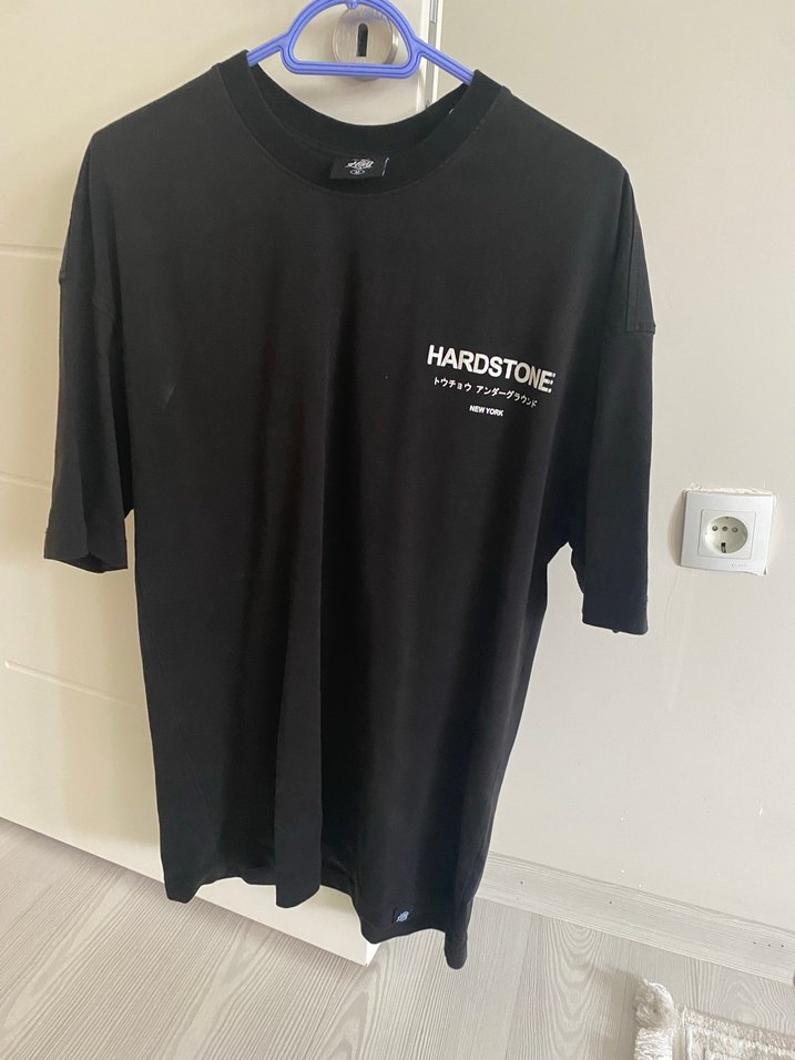 Siyah süet kumaştan, bol kesim Hardstone baskılı erkek tişört. Kısa kollu ve bisiklet yaka tasarıma sahiptir.