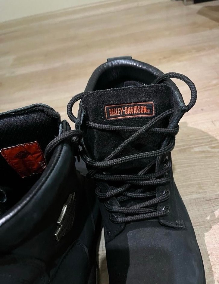 Siyah Harley-Davidson markalı, lastik malzemeden biker tarzı botlar, cırt cırt ve bağcıklı kapama detaylarıyla rock punk sokak stilini yansıtıyor.