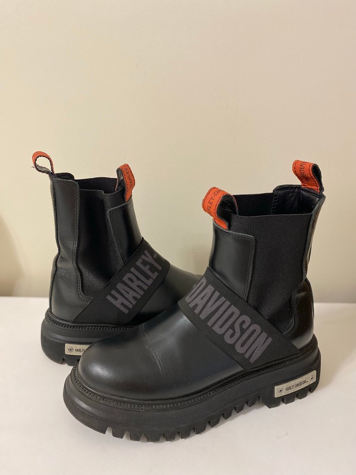 Siyah Harley Davidson yazılı bantlı, platform topuklu, kadın botları. Sokak tarzı ve rock punk havasında, günlük kullanım için uygun. 1 kış kullanıldı sadece bilek kısmındaki hafif bükülme mevcut