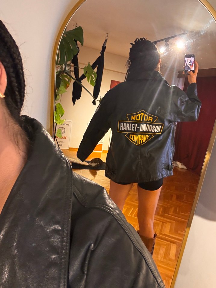 Dar kesim siyah deri biker ceket, uzun kollu ve yakalıdır. Arkasında Harley-Davidson baskısı ve tokalı detayları bulunur. Parti için uygun grunge punk tarzı boy 71 koldan kola66