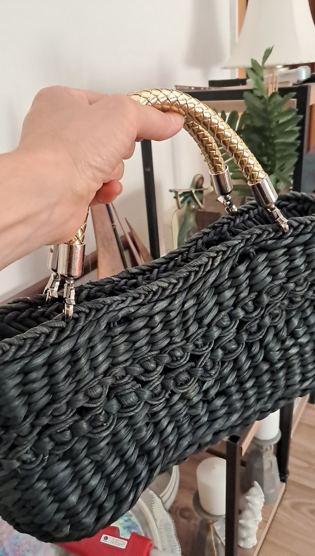 Hasır el cantasi Zincir detaylı, yılan deseni olan siyah örgü çanta. Bohem ve avant-garde tarzıyla dikkat çeker. Günlük kullanım için uygundur.