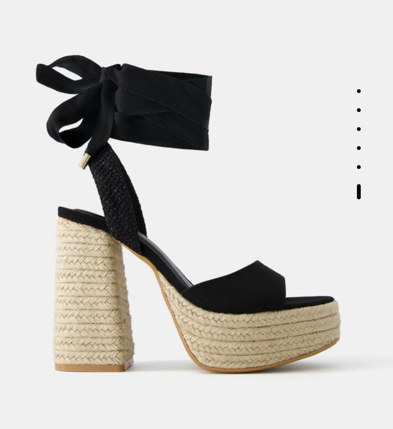 Hiç kullanmadım etiketli Bershka. Hasır dokulu topuk ve tabana sahip siyah platform topuklu, bağcıklı bilek kemeriyle bohem ve minimalist tarzı bir araya getiriyor.
