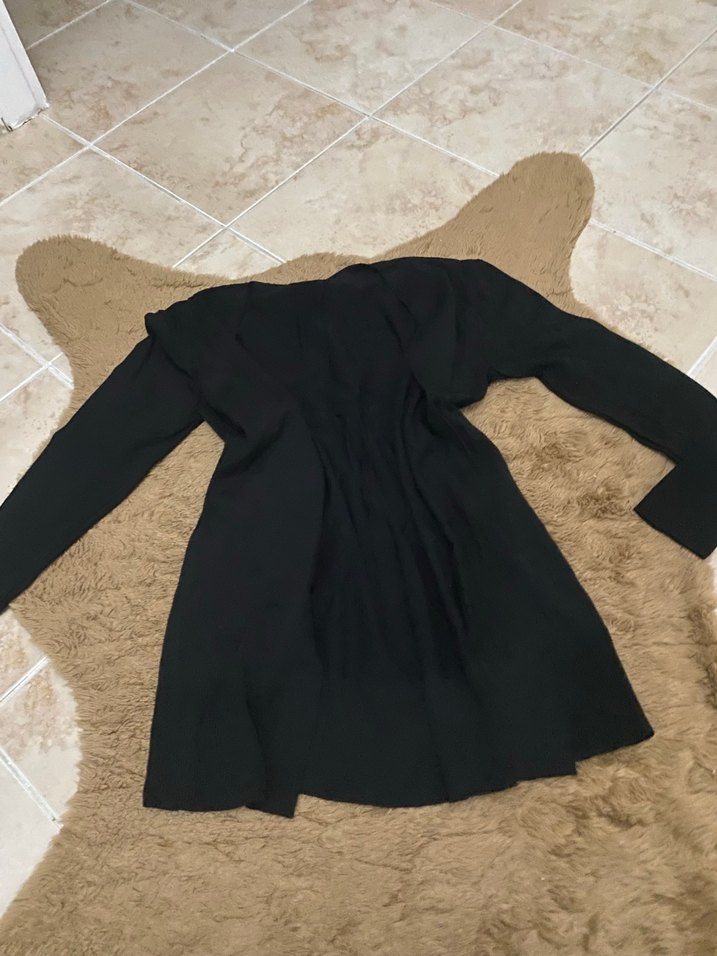 Siyah uzun keten kadın kaban, bol kesim ve uzun kollu. Drapeli detaylı, yakası kesik ve sade desensiz, günlük kullanım için uygun.