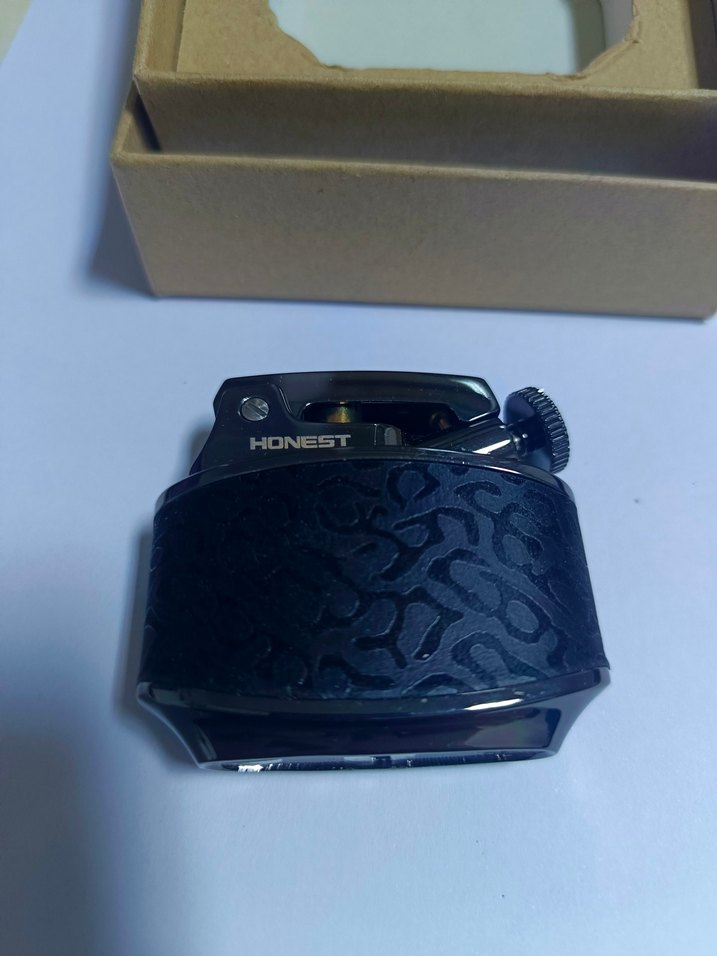 Desenli yüzeye sahip siyah HONEST marka küçük çakmak, hediye olarak uygun .