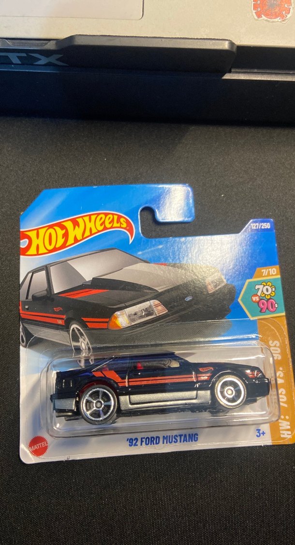Bu siyah Hot Wheels oyuncak araba, kırmızı çizgili '92 Ford Mustang modelidir. 7/10 serisine ait olup 3 yaş ve üzeri için uygundur.