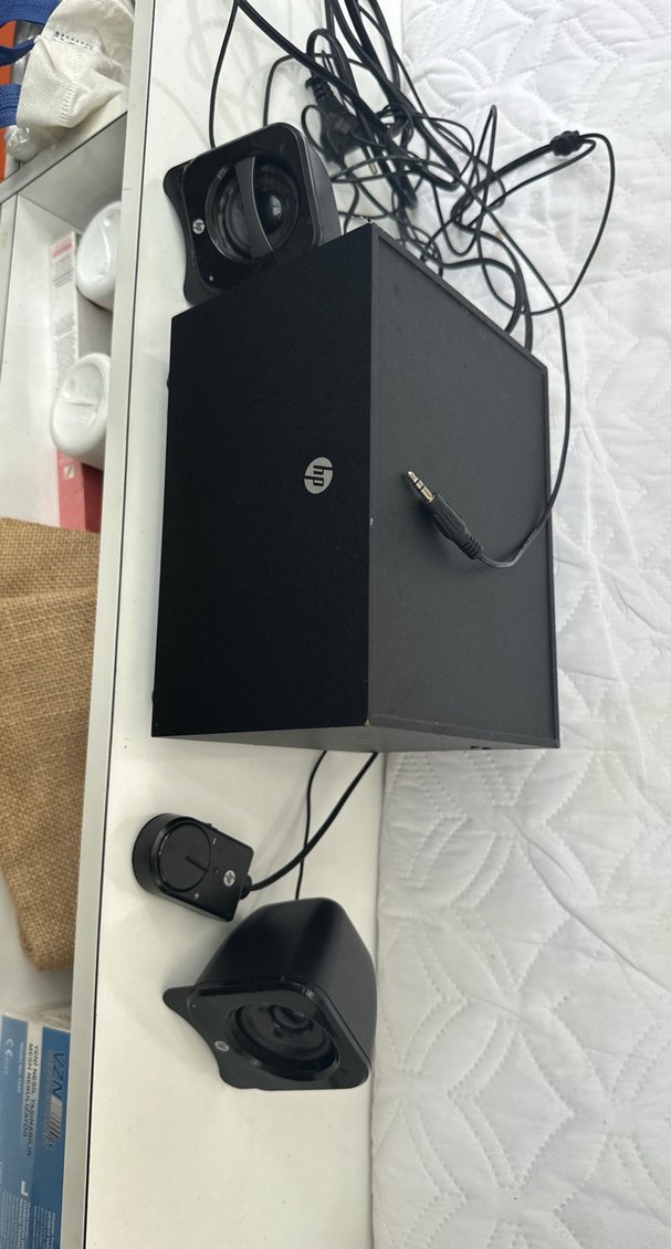 Kablolu uzaktan kumanda ve iki küçük hoparlör içeren siyah HP müzik sistemi. Bağlantı kabloları görünür durumda.